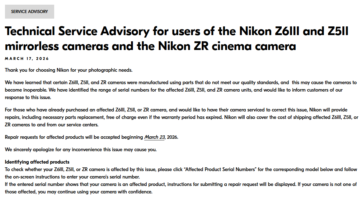 Not exactly the news I wanted to start my week with, but alas, so it goes. Nikon sent out this advisory earlier this week, and wouldn’t you know it, my month-old Nikon Z6 III was part of the advisory. When I called Nikon to inquiry about turn-around time, not only did they NOT have that info (depends on how many repairs they get), they were not even beginning the return process until this coming Monday, basically a whole week before I could send it back. Fortunately, as fortunate can be in this situation, I was within my return window at B&H where I bought the camera, and they are taking my return and will send me a new one. HOPEFULLY it isn’t also affected by the issue, in which case I will solve the problem much faster, almost before Nikon would even get my camera to begin with. And if it turns out the body I get swapped is also part of the advisory, then I may have to deal with whatever turn around Nikon has. But rest assured, I will not be quiet about it haha