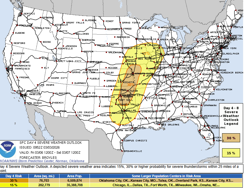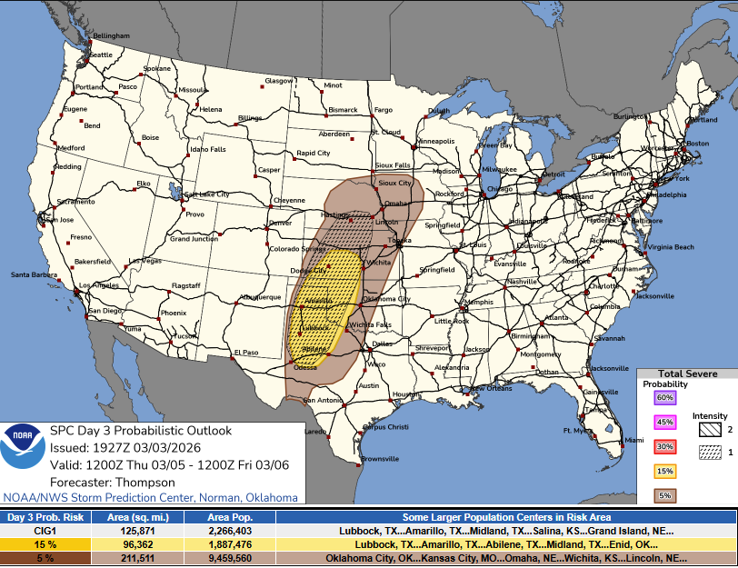 The SPC Day 3 (for Thursday), will kick things off for us as we’ll depart tomorrow to get into position, probably targeting our overnight stop somewhere in the Texas Panhandle and we’ll get up to look things over to decide where we’ll target for Thursday. I like this day for chasing IF we can get a couple storms up before dark. I think the tornado potential will go up after sunset, but any daytime storms oughta yield some solid views and probably some solid hail as well. We’ll track these storms north and east as we work our way to Friday’s target…