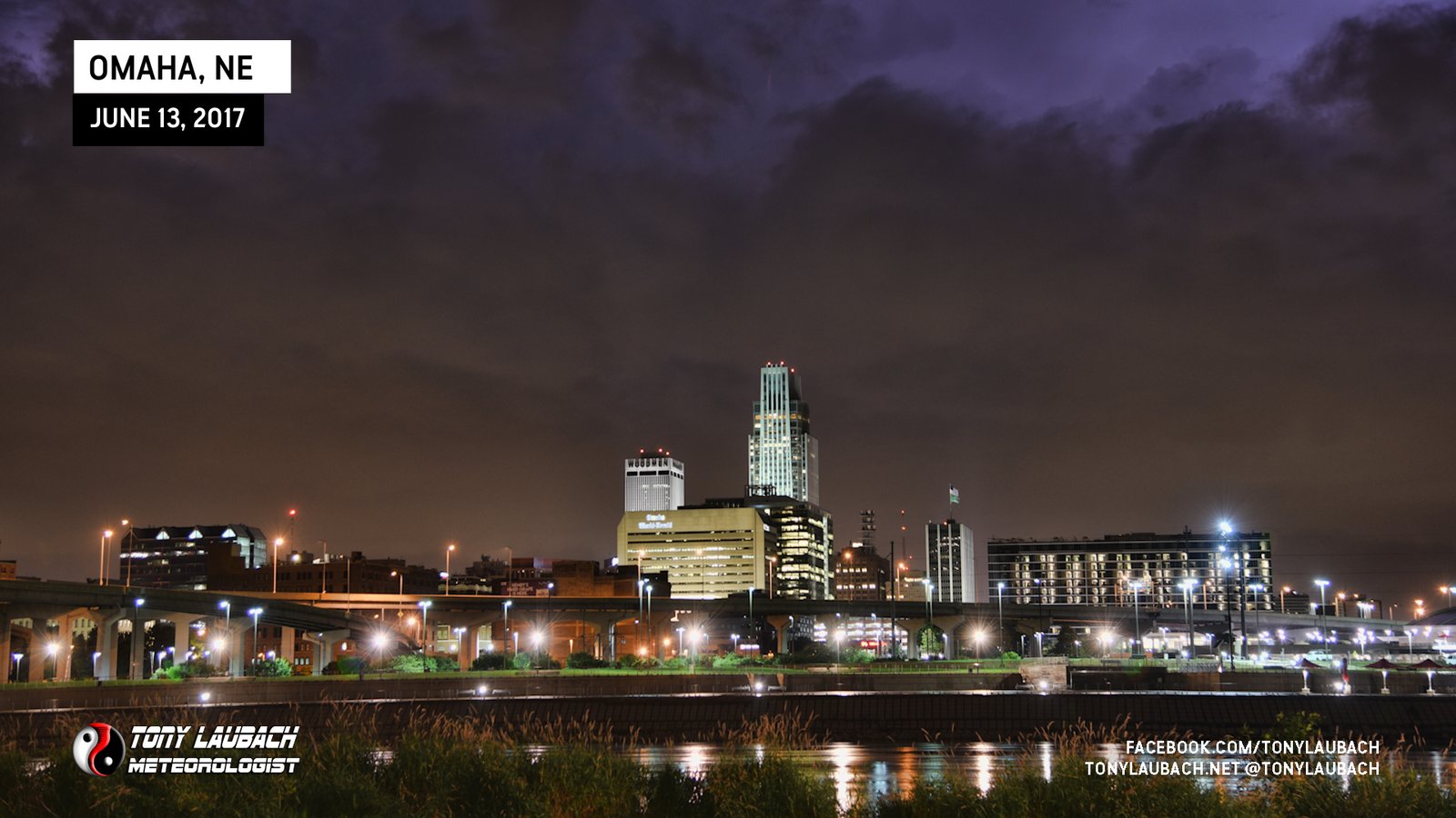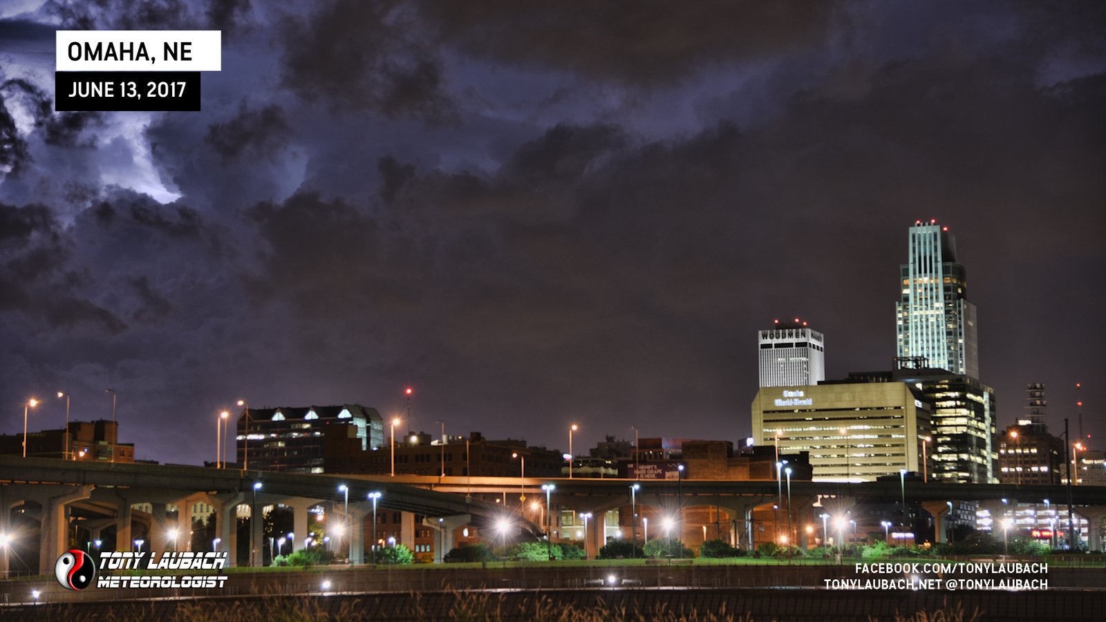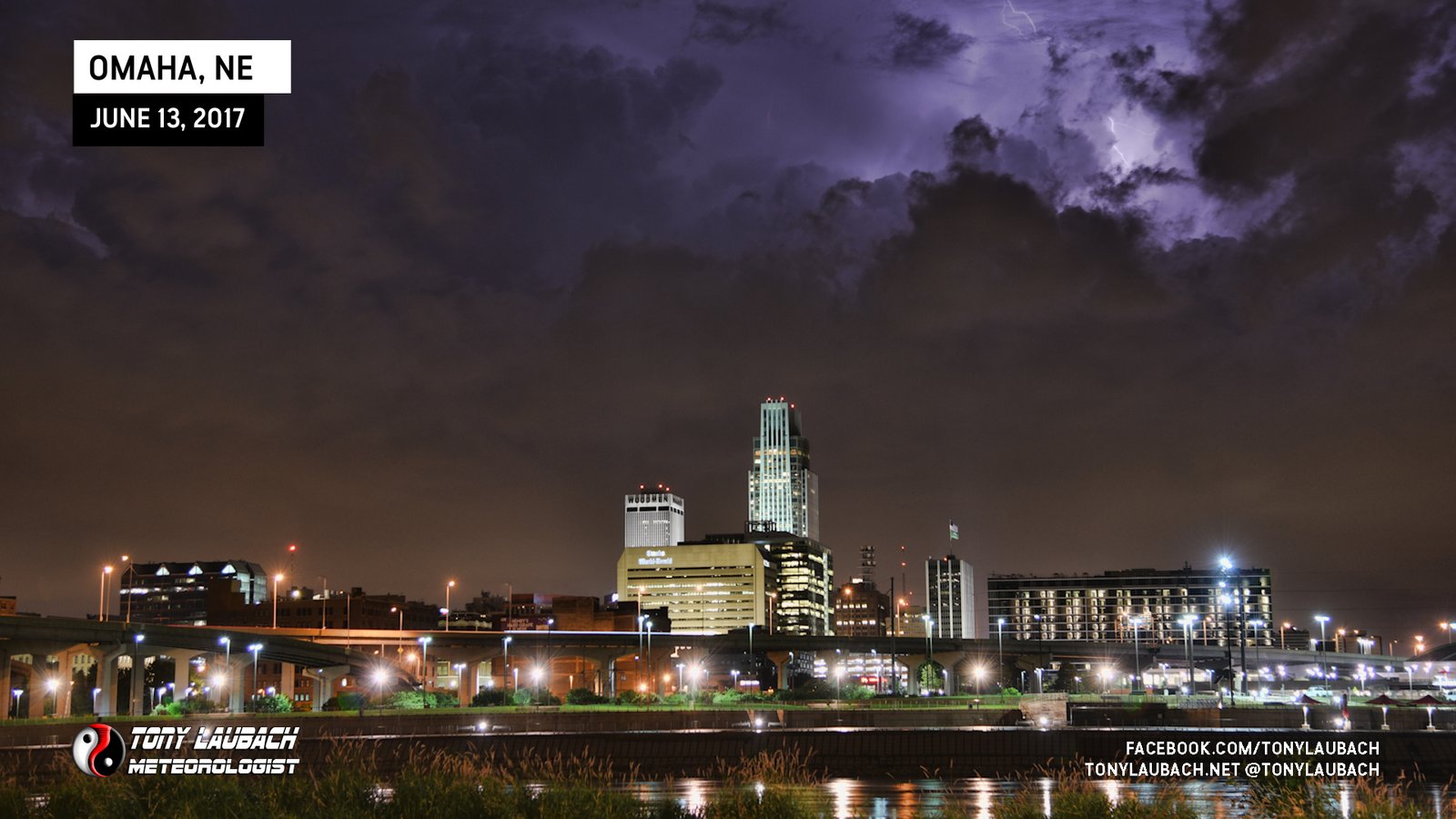 I opted for an overnight stay in Omaha, but the storms that I drove through that provided the nice sunset were also cranking out some amazing lightning. I figured if I could get on the other side of the river and set up in Iowa with the Omaha skyline in the foreground to capture some amazing CG action. I found a spot with a great view, the lightning was cranking, and I was ready to go…