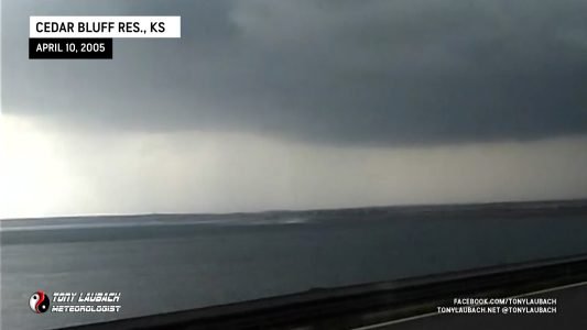 As we approached Cedar Bluff Reservoir along K-147, we observed a funnel cloud to our immediate north. Once we got some elevation as we approached the dam, we could see the swirl over the water’s surface, confirming the touchdown of the first tornado of the day! Yes, a waterspout in Kansas!