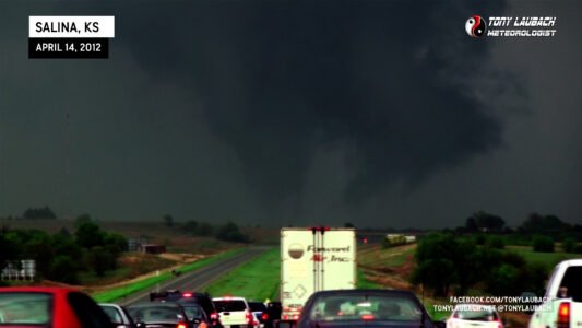 Traffic stopped on I-70 on the east side of Salina as a tornado develops east of town.