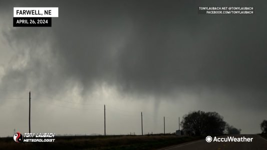 Chase partner Ed Grubb and I started the day in Concordia, Kansas… given the previous few events, in particular being burned on the April 16 event (running away from the surface low), we decided to make a b-line for the low north of Kearney. We had some reservations about whether this day was ultimately going to pan out (similar concerns to Dan and previous recent events). So after a lunch stop in Columbus, we shot back west as storms fired near Kearney and we rolled up to the storm east of Farwell, catching this brief little nader east of town. NWS Hastings says this was the initial stages of the Elba tornado, but this quick spin-up dissipated pretty quickly and we cannot confirm any continuous tornadic activity for a couple minutes after this lifted. I’d venture to say the main tornado was developing and this was a satellite of the big one based upon my observations.