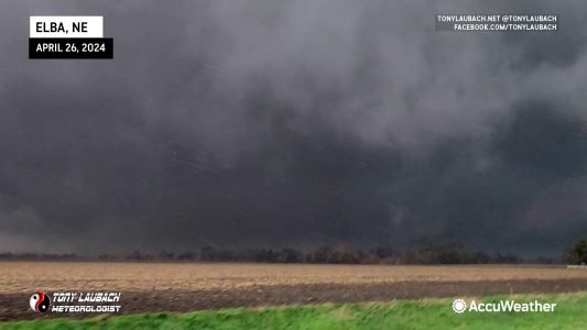 Once the RFD cleared and it was safe, we turned back around through Elba, shot east to St. Paul, then north on US-281 to make our second intercept of this storm. At the time, we thought we were observing the same tornado given the strength of the initial intercept north of Elba, but as Hastings has come out, this was a second, larger tornado southwest of Wolbach. This one we hung back about a mile or so as the visibility with this one was not nearly as good, so we opted not to chance it as close as the previous intercept. This RFD took down several trees in our immediate vicinity.