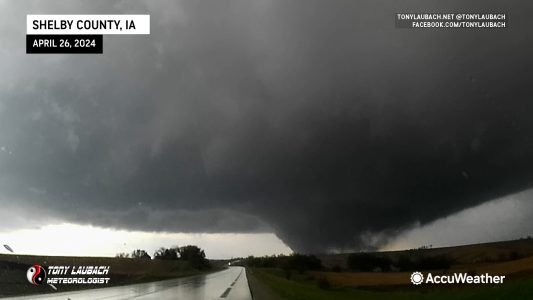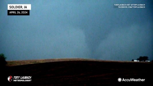 We eventually ended up on IA-141 heading east toward Manilla where what appeared to be a satellite circulation developed in the field immediately to our south and crossed literal feet in front of the hood. Original surveys had this tornado as a satellite to the bigger one, indicating that this brief tornado ended shortly before crossing the road. I believe what we encountered here was the literal final breath of that tornado. Future surveys and reports from NWS removed this apparent tornado, and I am unable to find the original report that contained this tornado info. Upon seeing that in the initial reports, I relayed this video to NWS, suggesting the track likely extended to the road with this swirl being its last moments.