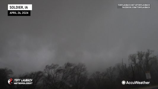 So it was about an hour before we got into Iowa, and when we did, the target storm was the one heading for the Harlan area. We had one storm to the north that we’d tangle with enroute, but by far the most impressive storm within our reach was the next one down the line. We needed to make Dunlap for a fuel stop, so that was the main goal at that moment. Turns out, the northern storm we were gonna skirt was producing a tornado taking aim on Soldier, and when we realized we could beat it there, we made the stop and observed this tornado briefly, crossing back to the northwest to the other side of town where another, less definitive tornado ripped through the trees northwest of town. We didn’t stay too long; just padded the stats and proceeded with gas and got ready to intercept the ‘Tornado Emergency’ coming up from Harlan.