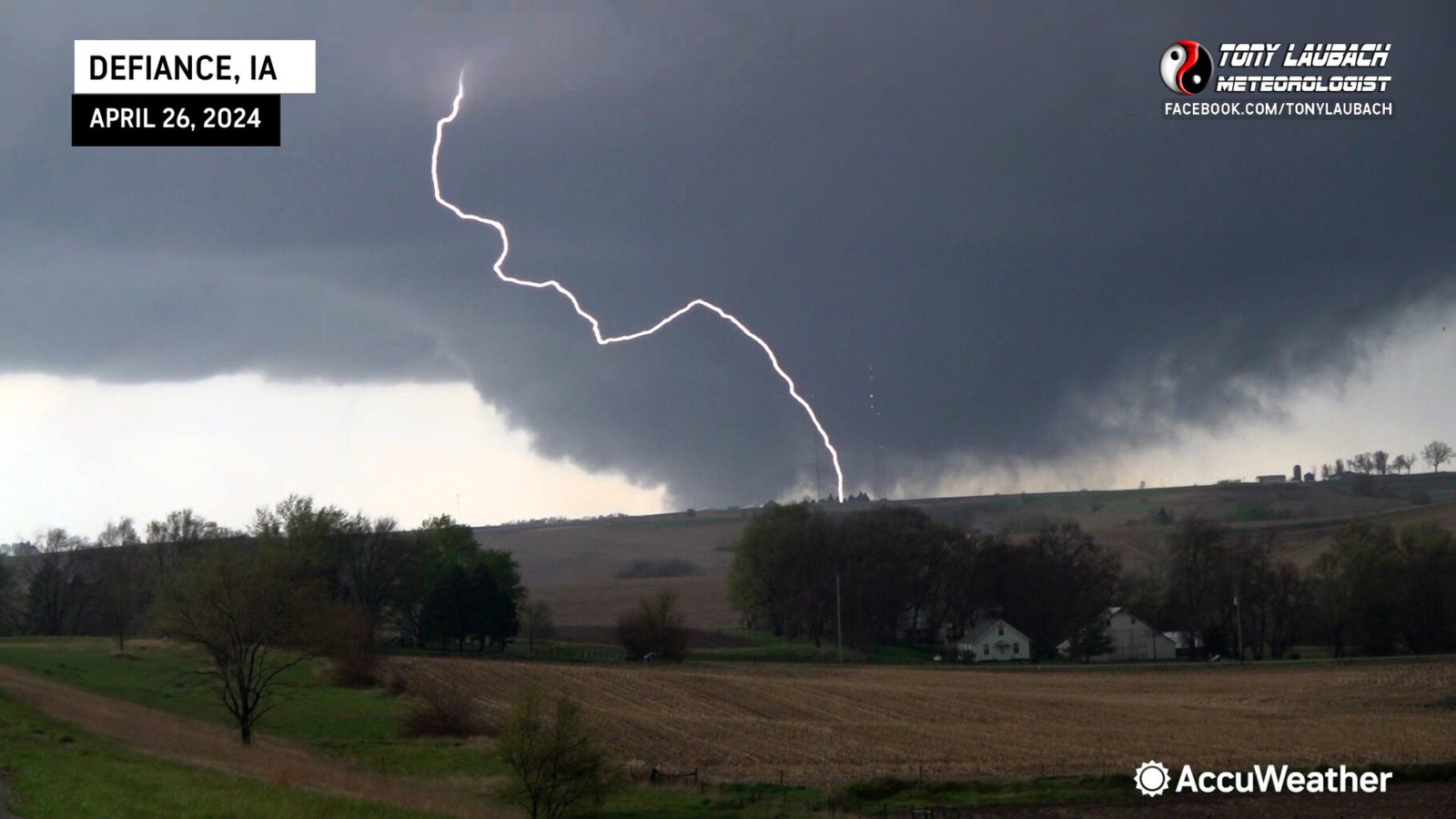 By this point, I was prepping for my 6PM live hit with AccuWeather. We were rolling through Earling just before the top of the hour when Ed got a visual on the lowering through the trees and hills to our south. We were approaching US-59, and the initial plan was to peel north to get in better position, but when we arrived at the junction and it was clear the tornado was still a ways to the south, we opted to poke south about two miles to setup on a hill with a great view of the approaching tornado. All this while we went into the live hit and crested the hill as I went on air with the tornado in full view.