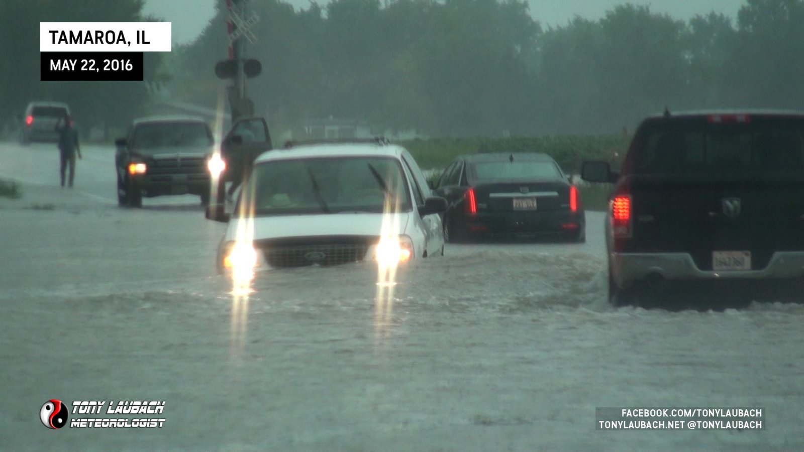 I pretty much headed straight up to Tamaroa where the heaviest rain had set up. I crawled my way up US-51 through Du Quoin, my usual flooding city, and managed to sneak up into town prior to US-51 getting shut down. Waters rose quickly in town, first taking over a Casey’s gas station on the south side. While I was up there, unbeknownst to me, US-51 to my south was being flooded out and was now impassable.