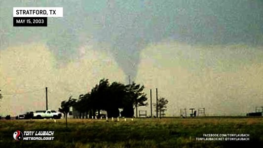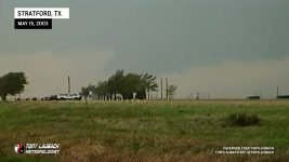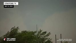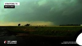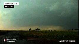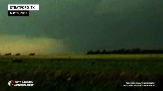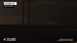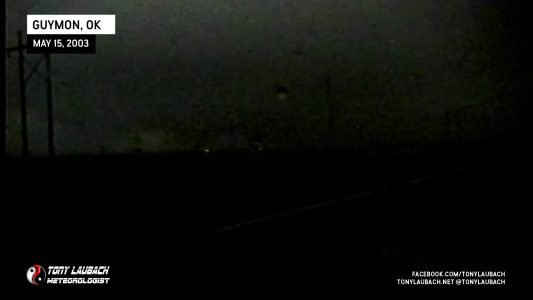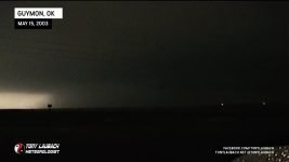 October of 2000 saw the last time I had seen a tornado… over two years later, my drought came to an end! After trucking south on Hwy 287 into the Texas/Oklahoma Panhandle on what became my first HIGH RISK chase ever, I intercepted a storm near Stratford, Texas that would drop a brief tornado behind some trees! This was my first ever tornado captured on video! At about the same time, a wedge tornado was on the ground behind a rain curtain near my location. That same storm dropped a rain-wrapped tornado just after dark south of Guymon, Oklahoma. weak power flash illuminated the second tornado of the day. Overhead wall clouds and other incredible moments highlighted my best chase to date!