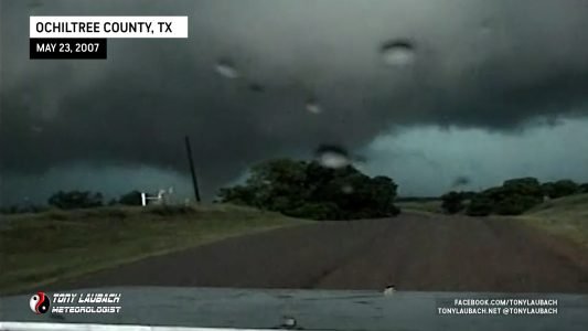 Before I could fully get out of the car, Tim jumped back into the passenger seat, instructing me to floor it to get up over the small hill. As we crested, we got a better view to confirm a second tornado was ongoing.