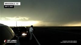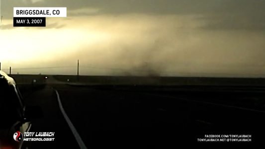 An afternoon jog into northeastern Colorado made for an easy, local setup and a good run before the big weekend in Kansas. The chase started grim as I sat in Platteville watching cu go up and flounder out. Ed Grubb joined me and we finally booked north towards Briggsdale after a tornado-warned cell went off on a line of eastward moving storms. We arrived to gustnado city as spin-up after spin-up ripped through the fields. One of the gustnadoes had a rotating lowering above the swirl, so we figured it made enough of a case to call it a tornado. Other spin-ups were certainly questionable and not as obvious, thus they were not counted. SPC reported 7 tornadoes; we’ll only confirm one as a weak tornado. To clear up a matter, I called the NWS in Boulder to report the spin-ups, calling them simply dust swirls at the leading edge of the line; dubbing them gustnadoes later in my report. Not long after that, an update to the tornado warning included multiple tornado sightings. I did not report tornadoes on that call; just dust swirls/gustnadoes.