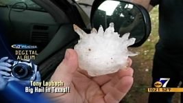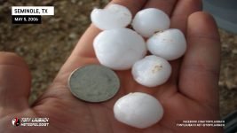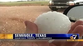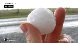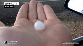 The storm suddenly made a violent and quick turn almost due southeast. Hail began to fall; marbles at first, then growing to quarters, then golfballs. Eric and Amos (in Amos’s truck) headed back southeast into town while Scott E and I hung back. Things looked like they were lightening up a bit. All of a sudden, a few baseballs started coming down. We were going to head back in to town when we heard Eric and Amos over the radio advising us NOT to head south cause the hail was bigger.