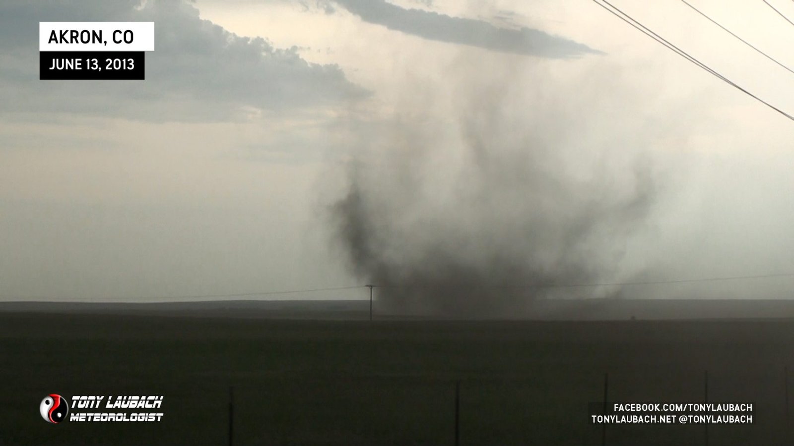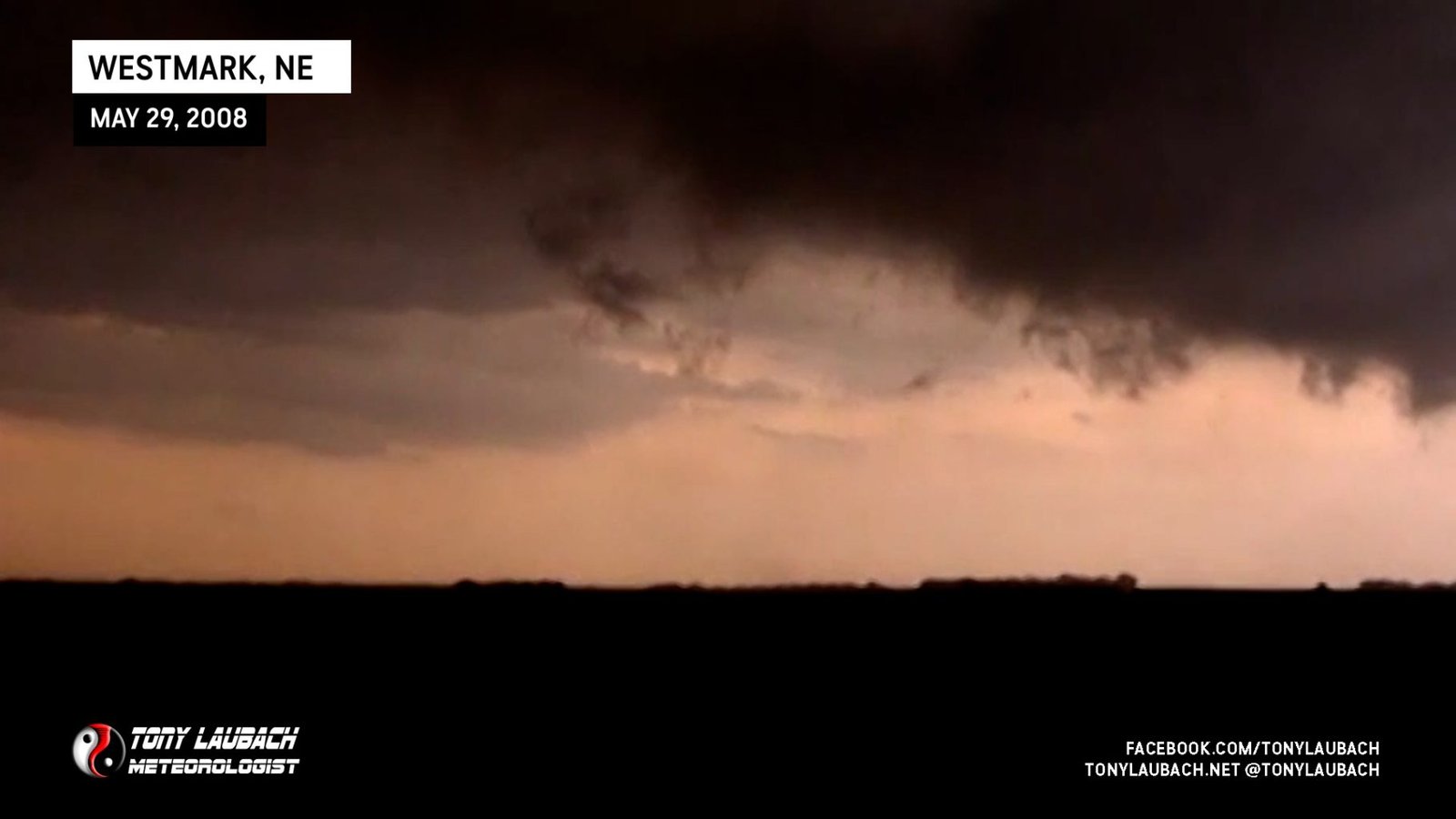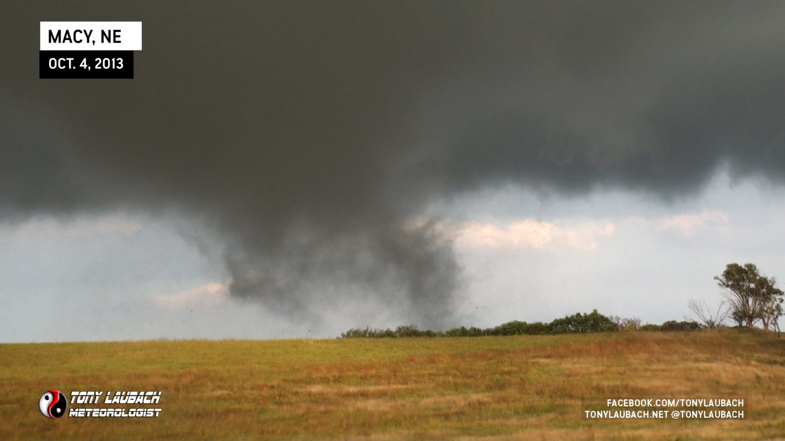 Intermittent touchdowns of a weak tornado north of Potter, Nebraska viewed from the east.
