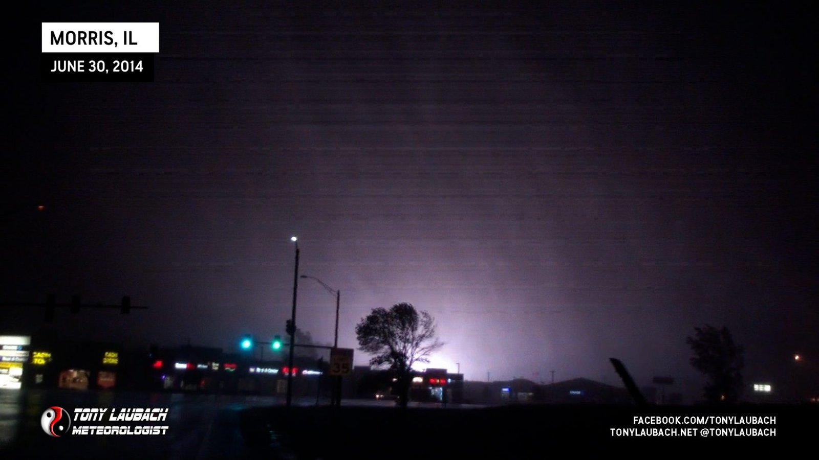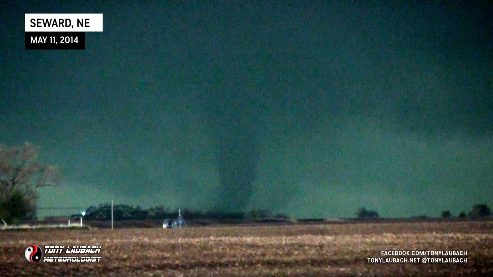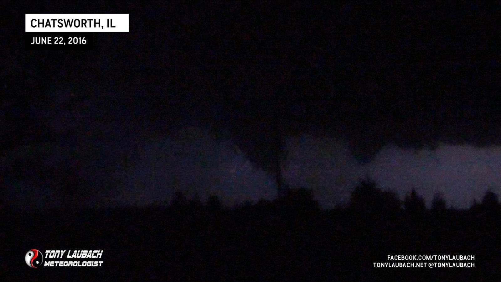Large, after-dark tornado seen from the southwest along side Warren Faidley.