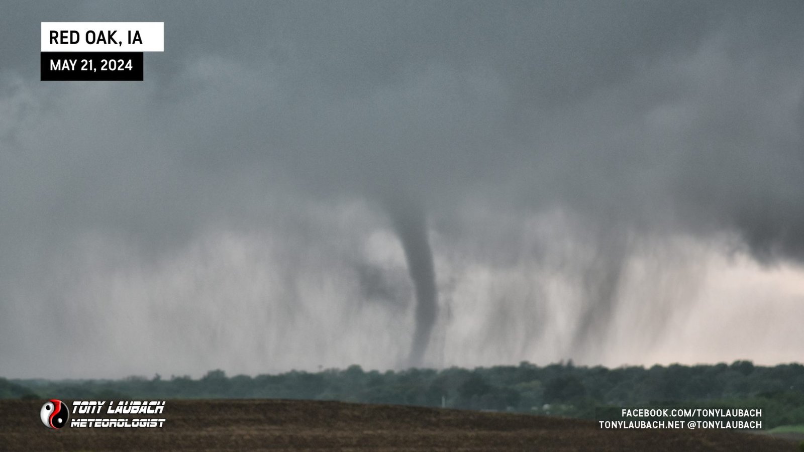 New tornado forms to the left as the other tornado dissipates, yet continues to produce ground circulation.