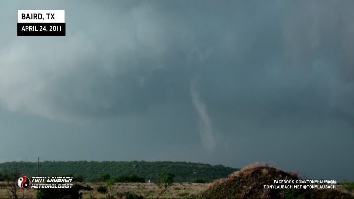 April 24, 2011 – Baird, Texas By Tony Laubach - April 24, 2011 FacebookTwitterPinterestWhatsApp Wispy, white funnel touches down near the ridge to our west with distinct dust whirl.