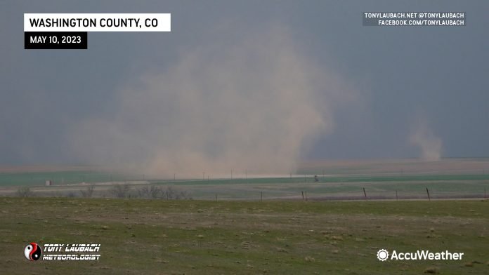 May 10, 2023 – Washington Co., Colorado By Tony Laubach - May 10, 2023 FacebookTwitterPinterestWhatsApp Larger of the two was a landspout as I observed a small funnel above this, could not confirm the smaller one further away.