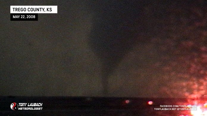 May 22, 2008 – South of Wakeeney, Kansas By Tony Laubach - May 22, 2008 FacebookTwitterPinterestWhatsApp Looking out the windshield as the tornado crossed our dirt road about a mile and change to our west. Dark cone touches down south of I-70 to our immediate west, vivid lightning striking all around us.