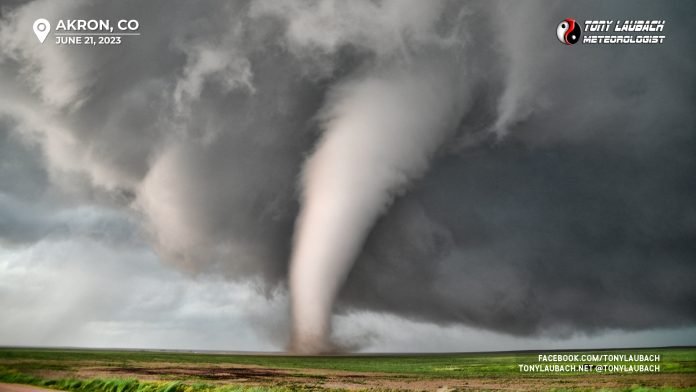 June 21, 2023 – South of Akron, Colorado By Tony Laubach - June 21, 2023 FacebookTwitterPinterestWhatsApp The main tornado in the twins/triplet sequence that I documented from birth to death from less than 200 yards to the south along CO-63.
